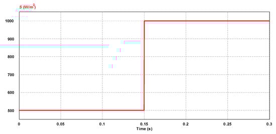 To analyze the power flow control proposed in Figure 18b, the irradiance pattern shown in Figure 33 was applied. The power output is 253 W and 480 W when the solar irradiance is and for a temperature of 25 °C, respectively. In addition, the DC loads consume 1 pu (800 W) during the interval corresponding to . At , the power absorbed by the load drops to 0.25 pu (200 W).