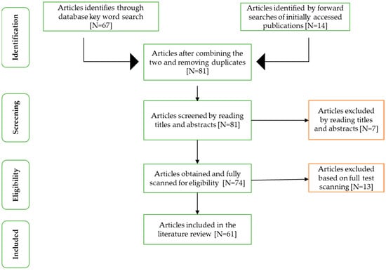 After the inclusion and exclusion process, a total of 61 relevant articles were identified. They include 27 peer-reviewed articles, 29 reports, and 5 web pages, as shown in Table 2. It is important to note that of the 27 peer-reviewed articles, 8 articles were supporting literature outside the given criteria, which were also used in this study.
