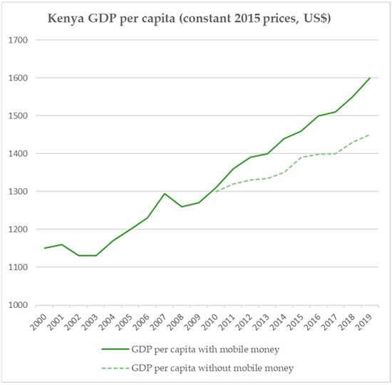 There is, however, evidence that in countries like Kenya, where mobile money services have been successfully adopted, economic growth is greater [49]. Figure 6 shows an estimation of Kenya’s GDP per capita with and without mobile money services. M-PESA was launched in 2007 and over the years the number of users of the service increased. As shown in Figure 6, Kenya’s GDP per capita was around USD 1600 in 2019. In the absence of mobile money services, the figure would be around USD 1450, implying that mobile money services have a positive effect on economic growth.