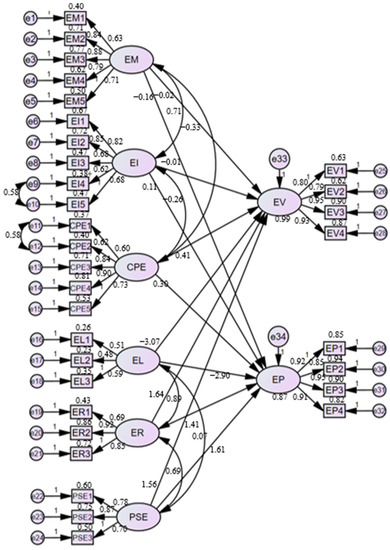 The load of environmental management in the supply chain on EM1~EM5 was 0.735, 0.815, 0.844, 0.755, and 0.6, respectively; the load for enterprises’ interests on EI1~EI5 was 0.667, 0.705, 0.755, 0.8, and 0.799, respectively; and the load on CPE1~CPE5 was 0.777, 0.777, 0.841,0.865, and 0.726, respectively. The environmental legislation of ER1~ER3 had loads of 0.785, 0.851, and 0.676, and the environmental regulation of GR1~GR3 had loads of 0.672, 0.847, and 0.869; the public supervision of PSE1~PSE3 had loads of 0.758, 0.866, and 0.756. The load of environmental violations on EV1~EV4 was 0.704, 0.878, 0.667, and 0.682, respectively, and the load of environmental penalties on EP1~EP4 was 0.845, 0.783, 0.859, and 0.83. Based on the above results of exploratory factor analysis, the research data in this paper had good reliability and validity.