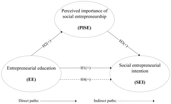 Many authors in the field of EI found that the relationship between EE and intentions was not straightforward. Some of the variables that have been shown to mediate the relationship between EE and EI are self-efficacy [59,60], entrepreneurial passion [45,59], individual entrepreneurial orientation and entrepreneurial motivation [17], entrepreneurial mindset [61], entrepreneurial competence [62], perceived desirability and perceived feasibility [60]. In SEI research, the indirect effect of EE is just beginning to receive the attention of researchers. Recently, authors of [22] found that EE affects SEI indirectly through entrepreneurial social networks. Based on the aforementioned research, it can be concluded that EE does not only act directly on SEI but that at least part of that influence is realized through a mediator variable. Thus, the way in which EE affects SEI should be examined in order to better understand the essence of this relationship. According to all of the above, it is assumed that: