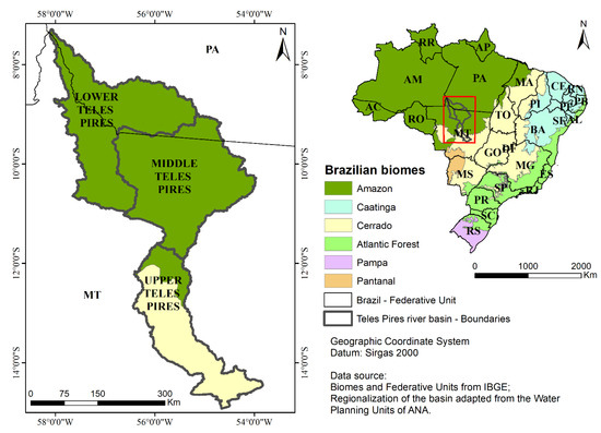 The Teles Pires River basin is located between latitudes 7°16′47″ and 14°55′17″ south and longitudes 53°49′46″ and 58°7′58″ west, occupying a territorial area of 141,524 square kilometers in the Brazilian states of Mato Grosso and Pará, within the limits of the Legal Amazon (Figure 1). Integrated into the Amazon hydrographic region, its main river is the Teles Pires, which together with the Juruena River is responsible for the formation of the Tapajós River, one of the main tributaries of the right bank of the Amazon River. The wide latitudinal extension of the basin causes it to have a diversity of environments, allowing for easy regional classification into the upper, middle, and lower Teles Pires (Figure 1). The lower and middle portions of the Teles Pires River basin are characterized by the presence of the Amazon biome, while the upper Teles Pires is marked by the Cerrado biome. The predominant climate in the area, according to Köppen’s classification, is Aw tropical climate with dry winter and rainy summer, present in the entire upper and part of the middle Teles Pires, while the rest of the basin has an Am humid tropical climate with a short dry season and more precipitation [39].
