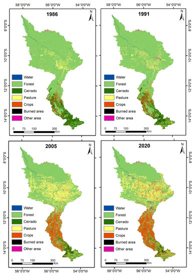 Maps of land use in the Teles Pires River basin during 1986, 1991, 2005, and 2020.