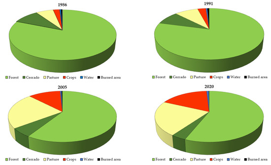 Change in land use classification percentages for the Teles Pires River basin for 1986, 1991, 2005, and 2020.