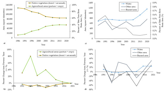 Native vegetation and agricultural (a) area, and (b) percent change from the previous time period, and water, other, and burned (c) areas, and (d) percent change from previous time period, in Brazil’s Teles Pires River basin from 1986 to 2020.