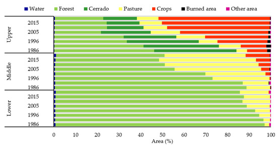 Evolution of land use in Brazil’s upper, middle, and lower Teles Pires regions in percent (%) of areas occupied per class.
