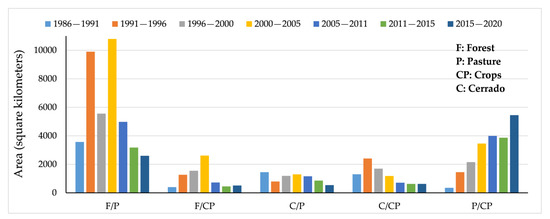 The conversion matrix makes it evident that the greatest losses of Cerrado and forest areas resulted from their conversion to crops and pasture. The forest had the highest loss of 37,900 km2, where 23,200 km2 was converted to pasture, and 12,700 km2 transitioned to crops. Forest losses were also recorded due to the conversion to water. The Cerrado had the highest proportion of losses compared to the pre-existing area, with 69% being converted to other uses, representing 9000 km2 of the lost area, of which 5800 km2 was converted to crops and 2100 km2 was opened to pasture. Losses of pasture area were also recorded during this period (1986 to 2020), and these were mainly due to the conversion to crops. As the main area conversions identified in the basin were from forest to crops (F/CP), forest to pasture (F/P), Cerrado to crops (C/CP), Cerrado to pasture (C/P), and pasture to crops (P/CP), these conversions were compared for all the yearly intervals mapped (Figure 7).