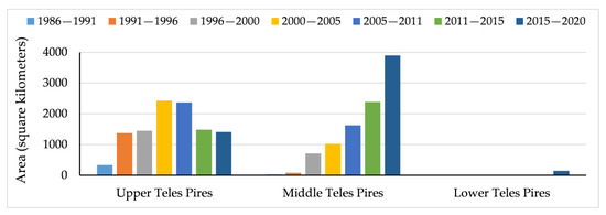 Water also increased between 2011 and 2020, from 737 to 1159 square kilometers, a 57% growth in surface area over this 9-year period (Figure 5c). The percentage increase from one time period to the next was more variable for other area and burned area (Figure 5d). Formed by the junction between areas of minority territorial occupation, the classification of other area also showed an increase, primarily from the growth of urban areas in 23 municipalities within the basin. Mining areas were mostly located on the banks of large tributaries of the Teles Pires River, especially in the middle portion of the basin. Burned areas could not be analyzed. Mapping burned areas requires consideration of the temporal distribution of wildfires, using images with dates that correspond to the end of the wildfire season taking place during the dry season, with 80 to 90% of fires occurring between the months of June and October [50].