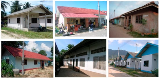 There were 712 two-story houses reconstructed in 13 projects; 166 houses were reconstructed in the same locations under four projects (Mitrapab Patthana, Tub Tawan 3, Moklen Ban Thung Wah, and Ban Lion), while 546 houses under nine projects (Rotary Pre Teow, Rotary Pak Wip, Bang Kaya, Moolanithi Chaipatana–Kachad–Suppanimitre, Sutthachon, Moolanithi Chaipattana–Kachad, Rotary Lam Pee, Rotary Tub Pla, and Nam Sai) were reconstructed in new locations. Figure 7 presents some patterns of the two-story houses built in the study area.