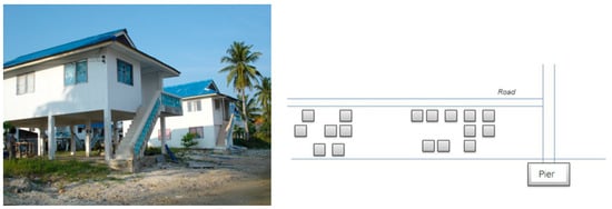 In Figure 5, new houses in Tub Tawan 2 were reconstructed in a parallel-lines layout. The pattern of houses was adopted from the destroyed houses, after consulting with the Moklen in this area. Single-story and raised-basement houses were also reconstructed in Thung Tuek, Koh Kor Khao Pier 1, and Koh Kor Khao Pier 2. No single-story or raised-basement houses were reconstructed in any other reallocated areas.
