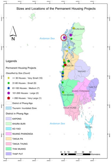 The number of houses in each reconstruction project was classified into five sizes: very small (<30 houses), small (31–60 houses), medium (61–100), large (101–200), and very large (>200 houses). Ten projects were classified as very small: six in Takua Pa District, three in Khura Buri District, and one in Thai Muang District. Nine projects were classified as small: six in Takua Pa District, one in Khura Buri District, and two in Thai Muang District. Six medium-sized projects were reconstructed in Takua Pa District. Two large-sized projects were built in Khura Buri District. One very large project, namely, Ruam Mue Ruam Jai, was built in Takua Pa District. The sizes and locations of these projects were analyzed using the flooded area or tsunami-inundated zone extracted from the ASTER image, as presented in Table 3 and Figure 10.