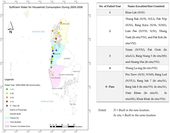 Figure 11 presents the recovery assessment of water for households’ consumption in each community after transferring to the reconstructed houses during 2005–2008. The number of criterion failings were counted and named together with the location (N = new location, outside the inundated zone; in situ = same location, inundated zone) and size information (VS = very small; S = small; M = medium, L = large, VL = very large; for example, N/VS1 = one very small project reconstructed in a new location). Six communities (indicated by blue stars), Pru Teow, Nam Khem, Bang Lud, Bang Sak 7, Bang Sak 8, and Khuk Khak, which are located near the city center of the subdistricts in the central part of Takua Pa, passed the criterion every year. However, Nam Khem, Bang Sak 7, and Bang Sak 8 did not pass this criterion before the 2004 Tsunami. During the recovery period, water consumption scarcity did not occur in Bang Lud, which had a very large permanent housing project reconstructed in a new location, Takua Pa District (passed in all 4 years). While a large project reconstructed in the same area of Pak Chok in Khura Buri District failed the standards in 3 out of 4 years. This implies that the situation of water consumption in Khura Buri had poorer management than in Takua Pa District. Before the catastrophic tsunami in 2004, most coastal communities failed the criterion of sufficient water for household consumption. For example, Pak Koh, Thung La-ong, Thung Tuek, Muang Mai, Triam, Thung Tuek, and Thung Rak still faced the worst situation in some years during the resettlement period. Nam Khem, Bang Sak 7, Bang Sak 8, and Khao Lak, which failed the standard before the tsunami, improved to the standard during the resettlement period.