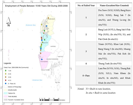 After the tsunami, Lam Pee, where very small and small permanent housing projects were reconstructed in new locations, passed the criterion during 2005–2008 but failed 4 of 7 years during 2009–2015. People who live in Nam Khem, with two in situ reconstruction projects, and people who live in Thung Rak, with two projects reconstructed in new locations, had more than 95% of their entire households employed from 2005 to 2015. The employment situation was better than before the tsunami. Khuk Khak, with a very small project of permanent housing reconstructed on the same ground, passed the criterion during the recovery period of 2005–2008, but it was slightly lower than the standard for one year during 2009–2015. In total, 14 communities failed the criterion in some years during 2005–2008. Thung La-ong, with a very small housing project reconstructed on the same ground; Pak Chok, with a large housing project reconstructed on the same ground; and Khao Lak, with a small housing project reconstructed in the new location, passed the standard during 2009–2015. The rest of the communities still had 1–2 years under the standard. As shown in Figure 12, the coastal communities that failed for 1–3 years during 2005–2008 earned their living from fishery. Some communities were located in the tourism hot spots in Phang-nga, such as Khao Lak, Bang Sak, Bang Niang, Pak Wip, and Pak Chok (Koh Phra Thong). Some of the failed communities were located a bit farther from the beach or on the higher ground in the agricultural areas. Once four years had passed, the communities shown by the blue points in Figure 12 were also well-known as being near one of the beautiful beaches in Phang-nga, such as Khuk Khak and Lam Pee. Thung Tuek (the red diamond in Figure 12), a community that failed the criterion of employment every year during 2005–2008, is located in Koh Kor Khao in Takua Pa.