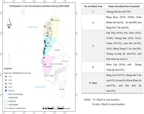 During 2002–2004, Pak Koh and Khao Lak had 100% of their households participating in the activities arranged in their communities for all three years. Muang Mai failed one year, in 2002, and Pak Wip and Pak Chok each failed two years. Thirteen communities failed the standard of participation during this entire period.