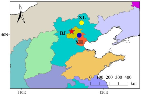 Distribution of regional research station and background research station of North China. The yellow and light blue dots represent regional station (XiangHe, XH) and background station (XingLong, XL), respectively. The red five-pointed star represents Beijing, the capital of China.