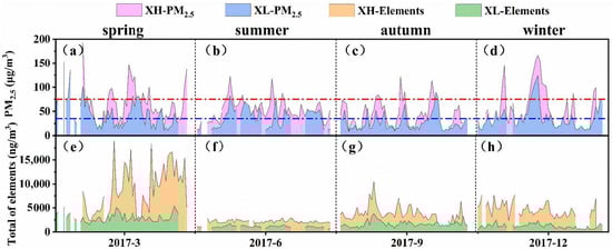 As shown in Figure 2e–h, the trend of total concentration in XL was similar to XH in 2017. Slightly different from the characteristics of PM2.5, the total concentration of elements in XH was 4744 ng/m3, which was significantly higher than that in XL (1717 ng/m3), especially in spring. XH had the highest concentration of total elements in spring with 8668 ng/m3, which was much higher than the 4690 ng/m3 in winter, 3856 ng/m3 in autumn and 2188 ng/m3 in summer. XL attained a similar variation pattern of XH, but the total concentration in spring was only 2928 ng/m3, which was about one third of that in XH. This was mainly because XH was situated in a rural area, which was greatly affected by anthropogenic activities, such as spring plowing and staggered production during the non-heating season, while XL was located in the mountains and was basically unaffected by human activities and the high vegetation cover was conducive to the reduction of particulate matter. Different from the seasonal variation of PM2.5, the concentration of total elements was much lower in summer and autumn. A possible reason was the higher boundary layer height and stronger scouring of rainwater and the viscosity of vegetation in summer and autumn, all of which were beneficial to the reduction of the concentration of elements, especially for the crustal elements.