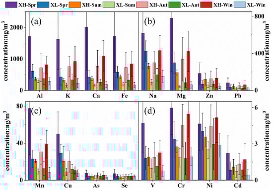 Figure 3 illustrates that although the concentrations of different elements vary widely, they share similar seasonal characteristics. The concentrations of Ca, Mg, Al and Fe were approximately 102–103 ng/m3, Zn and Pb were generally approximately 101–102 ng/m3, but the concentrations of V, Cr, Ni and Cd were below 10 ng/m3. In terms of seasonal variations, most of the elements appeared to have the highest concentration in spring, followed by autumn and winter, and the lowest concentration of elements occurred in summer. The slight difference was that the concentration of most elements in XH was higher in winter, while most elements in XL were higher in autumn. This was mainly because XH had more pollutants released by human activities and poorer diffusion conditions of pollutants in winter. Meanwhile, XL was free from human activities and the concentration of pollution was mainly from transmission; compared to autumn, XL had fewer potential source regions in winter, which can be seen in Section 3.4.