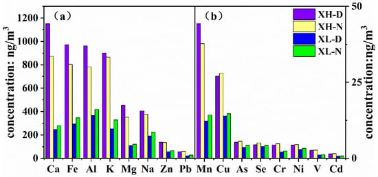 As illustrated in Figure 4, the daytime and nighttime concentrations of all elements in XH were higher than those in XL. The crustal elements at XH, such as Ca, Fe, Al, Mg, etc., attained diurnal concentrations of 1151 ng/m3, 972 ng/m3, 962 ng/m3 and 455 ng/m3, respectively, which were significantly higher than the nighttime concentrations of 872 ng/m3, 802 ng/m3, 782 ng/m3 and 352 ng/m3. This might be mainly due to the strength of anthropogenic activities in XH during the daytime, which increased the amount of agricultural dust and road dust, therefore the crustal elements increased significantly. With the weakening of anthropogenic activities at night, the crustal elements decreased significantly. The crustal elements in XL mainly came from the transmission of pollution, which led to completely different variation characteristics. With the decrease of boundary layer height during the nighttime, the concentration of crustal elements in XL increases significantly. Other polluting elements in XH and XL, such as Pb, Cu, As, Se, Cr, Ni, V, Cd, etc., were characterized by decreasing during the day and increasing during the night. The variation characteristics of these elements were similar to those of PM2.5, which were mainly affected by the reduction of the height of the boundary layer during the night.