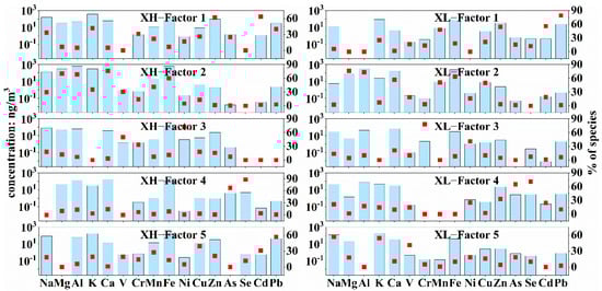 The contributions of other elements to factor 5 were uniform except for Cu and Pb in XH and Na and K in XL. The possible reason is that XL is a background station, so the high contribution of K might be affected by biomass combustion. There is no large-scale industry near XH, so we classified factor 5 as others.