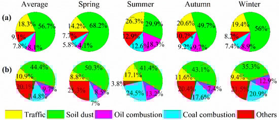 To analyze the changes in sources across different seasons, we calculated the proportions of different sources in the four seasons of 2017 (Figure 6). A comparative analysis showed that the proportion of soil dust was the highest in North China, accounting for 44.4–56.7% annually, with the highest proportion occurring in spring and the lowest in summer. The proportion of soil dust in the spring of XH was up to 68.2%, which was significantly higher than that in other seasons, which was largely because of agricultural activity, road dust and other activities around the station. Compared to XH, the proportion of soil dust in XL did not change dramatically, accounting for 35.3–50.3% in different seasons. Because of the high vegetation coverage and low human activity, XL obtained a much lower soil dust proportion than XH. Affected by the geographical location and traffic conditions, the traffic source in XH accounted for 18.3%, but only 10.9% in XL. Although the proportions of coal combustion and oil combustion in XL were higher than those in XH, the actual emissions in XL were lower than those in XH due to the lower total concentration of elements.
