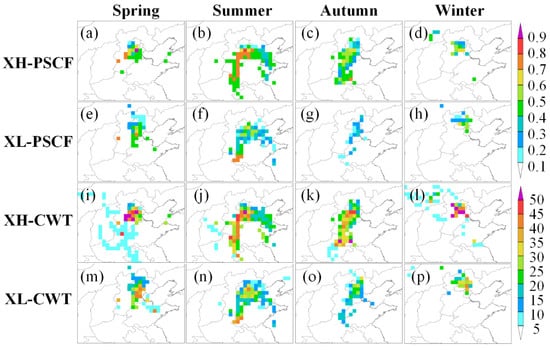 PSCF and CWT analysis of XH and XL in different seasons. (a–h) display the probability of the occurrence of contamination, (i–p) show the weighted concentration of PM2.5 in µg/m3.