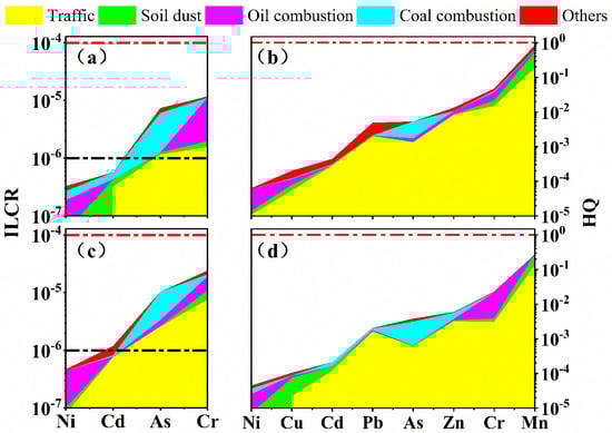 Health risk assessment from different sources. (a,b) represent the carcinogenic and non-carcinogenic risks of different sources in XH, respectively, (c,d) represent the risks in XL corresponding to XH. The red and black dots in (a,c) represent values of 1 × 10−4 and 1 × 10−6 for ILCR, respectively. The red dots in (b,d) represent HQ = 1.