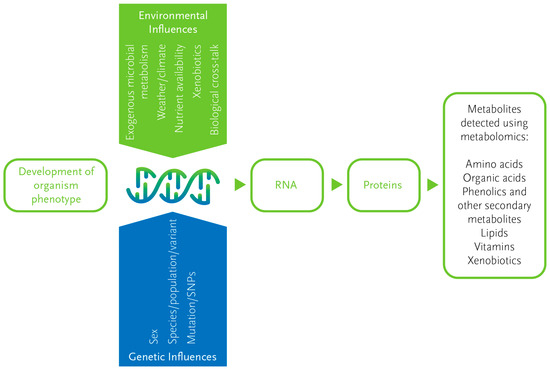 Influences on the metabolome. Metabolites reflect the interaction between genetics and the environment, and together with proteins, reflect the resulting phenotype of an organism. This makes the metabolome highly responsive to both genetic and environmental changes. SNP = single nucleotide polymorphism.