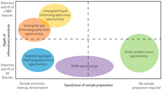 Mass spectrometry is more sensitive than NMR and can detect greater numbers of metabolites. While still expensive, it is cheaper and usually requires less laboratory infrastructure than NMR. The main limitations are that it is not quantitative without the use of standards (not all molecules ionise with the same intensity), and samples need to be extracted before analysis, which is time-consuming, especially for solid samples, and can add artefacts into the analyses [19]. As with all limitations, research in the field is on-going to mitigate these problems and improve the throughput and quality of metabolomics analyses.