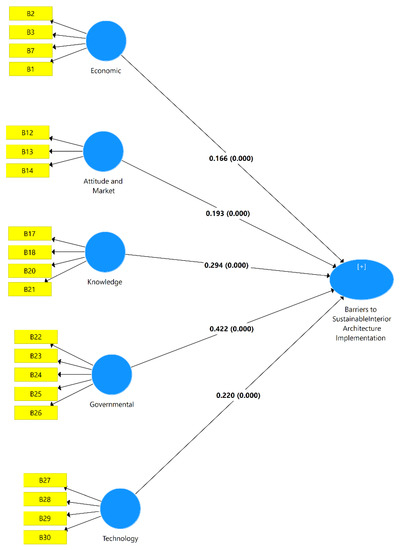 The expected value of the residual variance at this structural level is (€1), where (β) is the route coefficient between the sustainable interior design implementation obstacles’ constructions. In this case, the standardized regression weight corresponds to the weight in a multiple regression model. Its statistical significance hinges on whether its sign matches the model’s predictions. The current issue concerns determining the relevance of the route coefficient. The standard errors of the route coefficients were assessed using a bootstrapping method, also used for CFA. Based on a recommendation by Henseler, et al. [65], the t-statistics for hypothesis testing were calculated with 5000 subsamples. Five structural equations were developed for the PLS model, each expressing an inner relation between a build and Equation (1), to characterize the challenges inherent in implementing sustainable interior design.