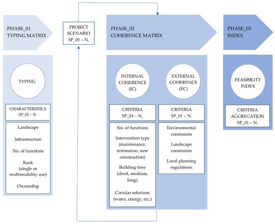 The methodology provides feedback between the Phase_02 and the project scenarios (output). As a matter of fact, a possible lack of coherence with the IC and EC criteria, such as the incompatibility with the regulatory framework, may require the need to redefine the project scenario.