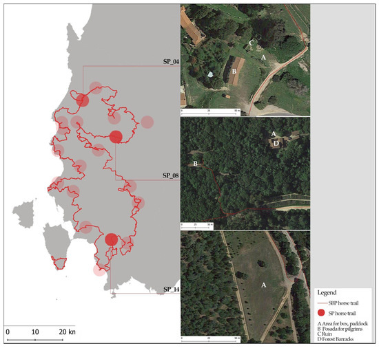 The above methodology was applied to three SPs of the horse trail of SBP, which have been selected by virtue of their geographical, landscape, physical, and functional characteristics. Moreover, the public or private nature of the SPs is of importance because the ownership significantly affects the implementation of the projects. The SPs falling in private areas are already configured, in most cases, as existing stables or riding clubs. On the contrary, the SPs falling in public areas are places where the design is required, especially with regard to the structures for the well-being of equids (horse-box, paddocks, and other services), for which the feasibility study is necessary. For this reason, the case studies selected to apply the methodology refer only to those SPs located on publicly owned areas.