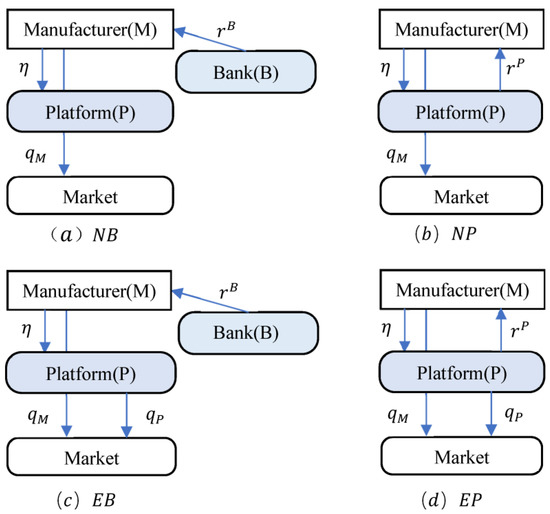 Therefore, we discussed four different situations NB, NP, EB, and EP according to the platform and the manufacturer’s different choices, as shown in Figure 1. The letter “E” indicates the platform that introduces the SB product, and the letter “N” is opposite; the letters “B” and “P” indicate the manufacturer’s financing choice (bank or platform).