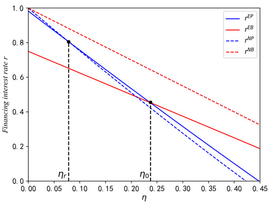 Next, we compare the equilibrium production quantities, prices, and financing interest rates under the NB and EB strategies, as shown in Proposition 2.