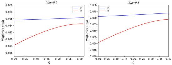 When , the manufacturer will choose the EB strategy in the case of platform encroachment and the NP strategy otherwise. Therefore, we must compare the EB strategy and the NP strategy. The platform first, we let . Solving the first-order optimality equation, we obtain the minimum point where . Note that we must have mentioned in the proof of Proposition 3. Because , which means when , we have . Therefore, , which means that the platform will benefit more from the encroachment. For the manufacturer, the proof is similar. The manufacturer will suffer losses due to encroachment, .