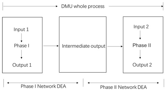 In addition, we used the two-stage network DEA model to calculate the above data. The model design is shown in Figure 1. The calculation results are consistent with the above results, which will not be repeated here.
