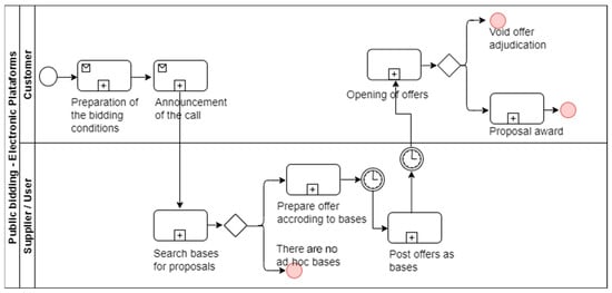 In the following, we will explain the public bidding processes of this electronic procurement. In Figure 1, we illustrate the process using BPMN graphical notations. First, we identify the actors according to their roles; two lanes represent them: the lower lane corresponds to the supplier and the lower lane to the customer. The empty circles represent the beginning of the procedure. The light red circles represent the end of a process. The clocks represent a deadline or a constraint; these should be noted after a process. The diamonds correspond to decision-making after a process. Rectangles correspond to sub-processes, and flows represent information messages or sequence controls. These multiple interactions are managed through electronic platforms.