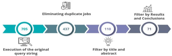 The search string was applied to the selected sources, and an initial quantity of 705 jobs was obtained (see Table 2). Then, the information was extracted using the export tools of each digital library. After eliminating doubly indexed jobs, the number was reduced to 437 jobs.