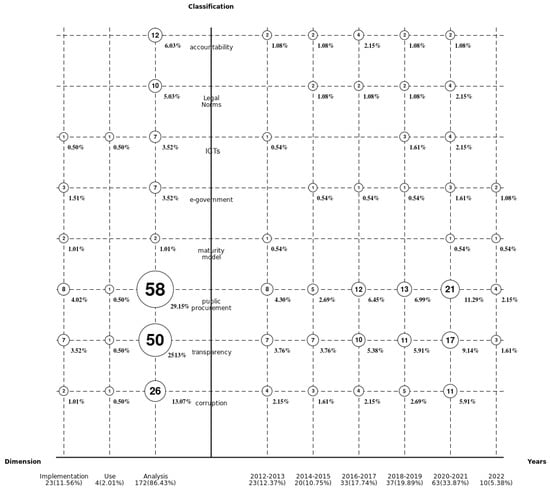 Classification scheme: For the classification of publications, a scheme with three dimensions was generated: temporal, type of proposal, and sub-area. In the temporal dimension, the papers are classified according to the year in which they were published, considering the last ten years, 2012–2022.