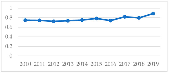 In this paper, the GDE in resource-based cities was measured using Model 5. The calculated GDEs during 2010–2019 are listed in Table A1 in Appendix A. Figure 2 shows the change in average GDE from 2010 to 2019. As can be seen in Figure 2, GDE showed a slow upward trend in fluctuations during 2010–2019, reaching a peak in 2019 at nearly 0.9. However, the overall GDE was relatively low in this period, at no more than 0.9. This suggests that although the green development performance in China’s 112 resource-based cities has been improved, there is still room for improvements in efficiency.