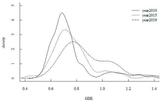 To visually observe the distribution and dynamic evolution of GDE, this paper further created a kernel density diagram, as seen in Figure 3. The graphical presentations include the GDE in 2010, 2015 and 2019. It can be seen that GDE distribution presents a single peak. In 2010, most GDEs concentrated on 0.7, and many cities have not reached an efficient frontier. It is worth noting that from 2010 to 2019, the peak tends to shift right and lower, meaning GDE increased in most cities and the development structure of China was consistently adjusted and optimized. This also suggests that GDE is influenced by ISU and HCSU to a certain extent. The year 2019 exhibits a flat curve, with GDE gradually dispersed among cities, which can be related to the different conversions of input to corresponding pollutant discharges and economic benefits in different cities.