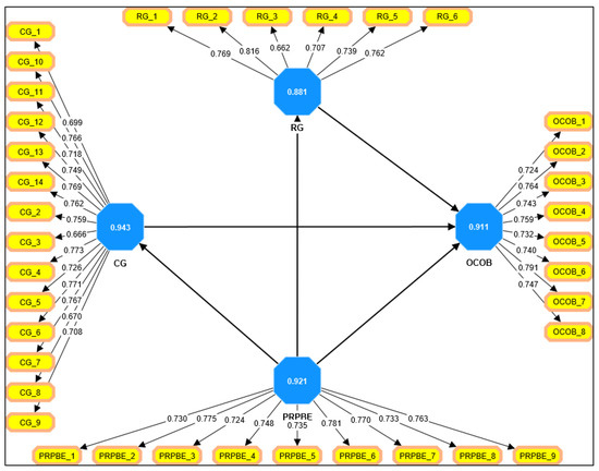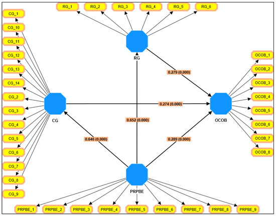 To test the influence of the personal relationship between boundary personnel on organizational customer opportunism behavior, the opportunistic behavior of organizational customers was taken as the dependent variable and the personal relationship between boundary personnel was taken as the independent variable. The data were statistically analyzed by using the Smart-PLS Software version (4.0.8.5). Table 6 shows that the overall effect of the model was significantly improved and the personal relationship between boundary personnel (β = 0.289, p < 0.001) significantly promoted organizational customer opportunistic behavior. The data support hypothesis H1, which is that the personal relationship between employees at the boundary of an enterprise is positively correlated with the opportunistic behavior of organizational customers. The closer the personal relationship between employees at the boundary, the greater the chances of organizational customers’ opportunistic behavior. H2 states that there is a positive relationship between the personal relationship and relationship governance. H2 was accepted in this study (β = 0.646, p < 0.001). H3 states that relational governance positively affects organizational customer opportunistic behavior, which was accepted (β = 0.279, p < 0.001). A positive relationship exists between the personal relationship and contract governance (H4). In this study, H4 was accepted (β = 0.652, p < 0.001). H5 states that there is a negative relationship between contractual governance and organizational customer opportunistic behavior. H5 was accepted in this study (β = 0.274, p < 0.001). Figure 3 is a graphical representation of the structural model.