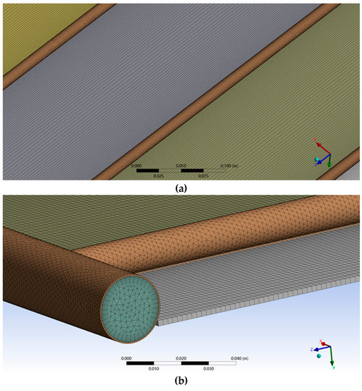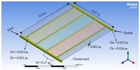 A three-dimensional FPSC has been simulated in this study using the CFD package ANSYS Fluent [41] for analyzing the fluid flow behavior and the temperature distribution across the collector. The geometric details of FPSCs are extracted from the experimental work reported by [13] that the model was validated against. The computational domain of our modeling is shown in Figure 1, which comprised an aluminum absorber plate, two copper headers, and four connector riser tubes of the same material.