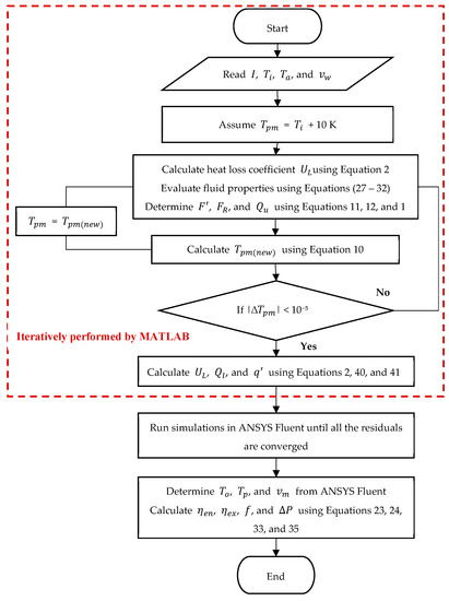 The methodology and iteration procedure followed in determining the performance of the FPSC is presented in Figure 3. Initially, a MATLAB program was used to determine the overall heat losses. must be known for calculating the overall heat loss coefficient (), as shown by Equations (2) and (3). Therefore, an initial arbitrary value of is chosen that is 10 K higher than the fluid inlet temperature (), as per the recommendation of [27]. Then, and is determined from Equations (1) and (2). Following that, Equation (10) was used to determine the new value. The program then re-evaluates and using the updated value of . This procedure is repeated in an iterative manner until the convergence criteria is satisfied. The total heat loss () per unit area of the FPSC is then estimated as follows: