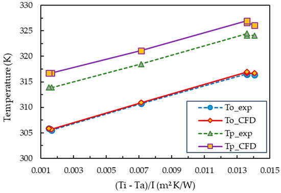 The validity of the present numerical model is tested by comparing the results of the absorber plate ( and collector outlet ( temperatures with the experimental findings of Jouybari et al. [13] for the case of nanofluid (/water) with 0.6% nanoparticle volumetric fraction and a 0.0333 kg/s (2 L/min) flow rate. The input variables for the CFD model are uniform inlet velocity (), uniform heat flux (), inlet temperature (), and ambient temperature (). The physical properties of silica nanoparticles () are taken from the same publication and the experimental values of input parameters including , , and were obtained from the authors. The comparison of numerical and experimental values of the collector outlet and absorber plate temperatures is shown in Figure 4. It is demonstrated that the values of and predicted by the simulation and the reported experimental findings accord well. The numerical results for and deviate from the experimental data by 0.13% and 0.91%, respectively.