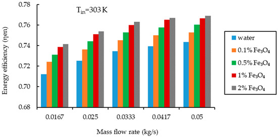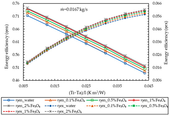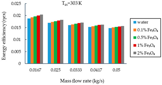 Thermal or energy analysis alone cannot demonstrate the benefits of employing nanofluids in solar collectors. For the thorough identification of the usefulness of nanofluids, exergy analysis and the pressure drop that occurred in solar collectors are equally important. Exergy is the maximum useful output produced by the system in relation to the temperature difference [16]. Several studies using nanofluids as solar thermal fluids have examined the energy and exergy of FPSCs. An experimental evaluation of an FPSC was performed using various nanofluids including water-based MgO, Al2O3, TiO2, SiO2, CuO, Graphene, and MWCNT. At the optimum values of flow rate and nanoparticle fraction, which were 1.5 L/min and 0.75 vol%, respectively, a MgO water nanofluid exhibited an enhancement in exergy and energy efficiencies of 32.23% and 9.34%, respectively. Additionally, among various nanofluids, the greatest increase in energy and energy efficiency was demonstrated by MWCNT water nanofluid, with respective values of 23.47% and 29.32% [17,18]. Another experimental evaluation of an FPSC using Al2O3 and CuO demonstrated that Al2O3 provided the best collector performance with a 1.0% volume fraction, outperforming water with a 21.9% and 56.9% improvement in energy and exergy efficiencies, respectively [19]. Thermodynamic optimization of an FPSC was conducted by Okonkwo et al. [20] with Al2O3 water and Al2O3-Fe water nanofluids. The collector’s energy efficiency improved by 2.16% for Al2O3 and reduced by 1.7% for Al2O3-Fe. However, the exergy efficiency was improved for both nanofluids.