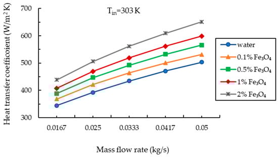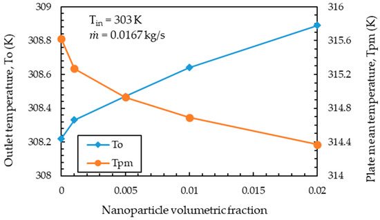 The dimensions of the FPSC geometry and nanofluids’ thermophysical properties are used as the input data for the numerical model. The input operating parameters also include the mass flow rate () and inlet temperature (), with respective ranges of 0.0167–0.05 kg/s and 303–333 K. Four volumetric fractions of nanoparticles—0.1%, 0.5%, 1%, and 2%—are used in the present investigation. Environmental factors such as wind speed, solar insolation, and ambient temperature are considered constant with values of 2.5 m/s, 800 W/m2, and 298 K, respectively.