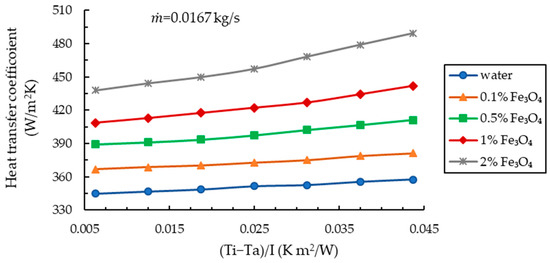 An experimental and numerical investigation using alumina nanofluid (Al2O3) in an FPSC operating at 5.5 L/min showed an enhancement of 18% in the collector’s energy efficiency in comparison to water. The numerical outcomes further demonstrated that Al2O3 nanoparticles were effective in FPSC up to 0.5% volume concentration, but that above this concentration, the thermal efficiency deteriorated [14]. A sensitivity analysis of FPSC’s energy efficiency was performed by Tong et al. [15] using Al2O3, CuO, MWCNT, and Fe3O4 nanofluids at various operating parameters. According to their investigation, FPSCs had the highest efficiency (87%) for MWCNT of all the nanofluids tested, but it was also the most susceptible to changes in operating conditions. The least sensitive material to changes in operating conditions was found to be Fe3O4.