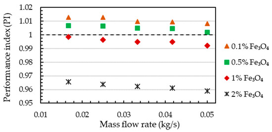 It appears that an effective approach has a performance index () greater than 1, in which case substituting nanofluid for the base fluid in FPSCs is favorable. If the performance index is below 1, using the nanofluid in the system is not feasible.