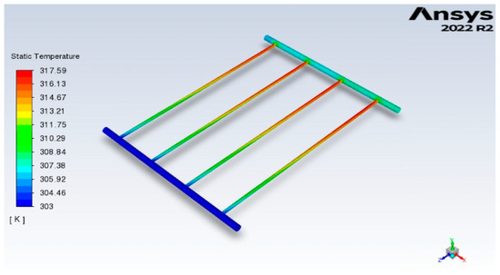 The next step is to apply heat flux into the ANSYS Fluent model, along with the appropriate boundary conditions to obtain the value of outlet temperature (), which is then used to determine energy efficiency (), exergy efficiency (), and pressure drop (∆P) of the FPSC. It is essential to mention that fluid flow was assumed to be uniform in MATLAB for estimating the heat losses; however, the actual mass flow rates and corresponding average velocities in risers can be obtained from the computational model (Fluent). Therefore, the average velocity in each riser is determined from the CFD model and is employed in the pressure drop calculations of the FPSC.