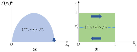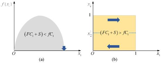 When , its replication dynamic stability analysis is shown in Figure 3b. can be obtained from the model. At this time, it can be divided into two cases for discussion. When , , and , x = 1 is the stable point of evolution. The enterprise will finally choose the “collaborative innovation” strategy. When , , and , x = 0 is the stable point of evolution. The enterprise will finally choose the “independent innovation” strategy.
